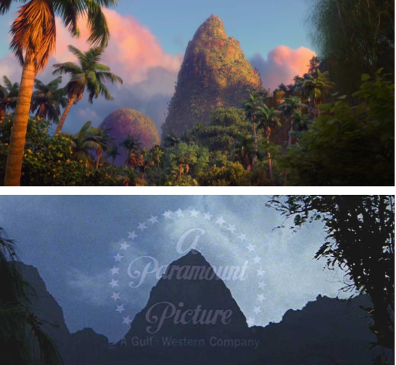 Sucede que para Los Cazadores del Arca Perdida, la escenas del templo en Sur América, las del inicio, se filmaron en Hawai, y estando allí se le ocurrió a Spielberg usar una montaña para el efecto del fundido entre el logo de la Paramount Pictures y el paisaje de la selva...algo que se convirtió en una costumbre en todas las pelis de Indy, con diferente paisaje claro. Entonces Frank Marshall halló la famosa montaña que parece en el film...como ves, es una montaña que tiene una forma particular...claro, parece cualquier montaña, pero el hecho de que esté en Hawai es muy importante, dado que Moana está situada en esa zona...y usando la imaginación me da por pensar que casualmente es la misma montaña..