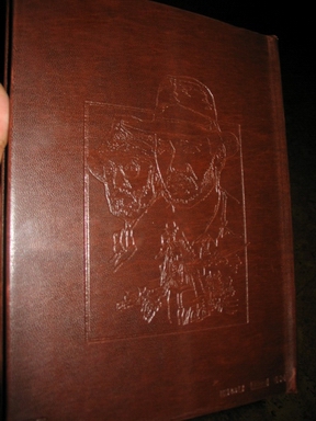 Las tapas son de piel, y la caratula esta tallada en la piel con una gran calidad. Tiene un ancho de 17 centimetros y un alto de 22 centimetros y medio, el grosor es de 2 centimetros.