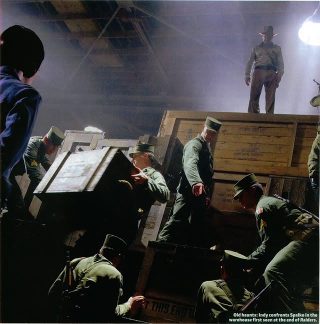| Curiosa la foto del almacén... todos los soldados actuan como si Indy no estuviera ahí, salvo uno a la derecha que le está encañonando, y Spalko no tengo muy claro que esté mirando a Indy... por otro lado, si le tuvieran prisionero no le tendrian ahí subido sobre las cajas... me gusta, es todo un spoiler pero es lo suficientemente ambigua como para no aclararnos la situación en la que se produce la escana. |