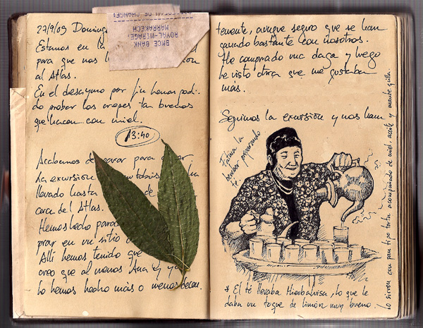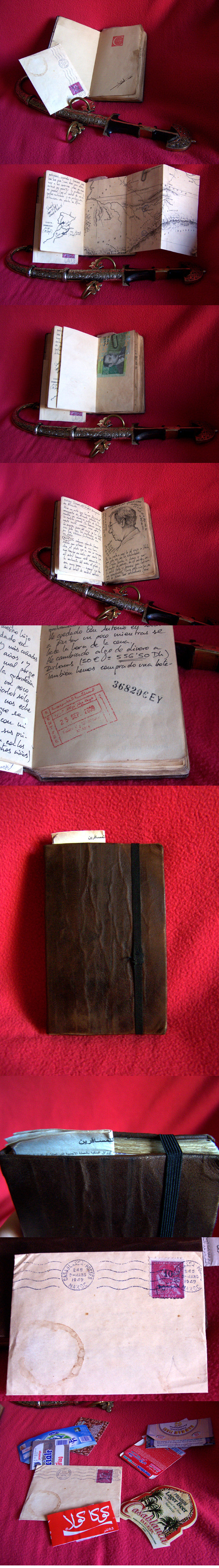 Tiene un mapa desplegable inspirado en el Hero , algunos inserts doblados como en el Hero , el billetito de rigor ( 50 dirhams ) , y un sobre que hice para meter dentro las cosas que "desentonan" en un diario envejecido como : etiqueta de cocacola , de agua , tarjetas de sitios... en fin , lo que no se puede envejecer)