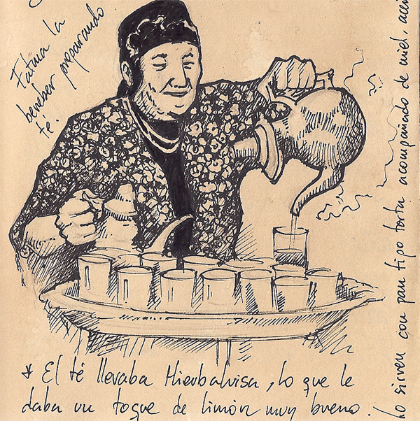 Creo que esta señora , por la calidad del té , y por su valentía al abrir la casa al turista , en una cultura donde eso no estaba bien visto , se merece al menos un dibujillo en el diario de Marrakech.
