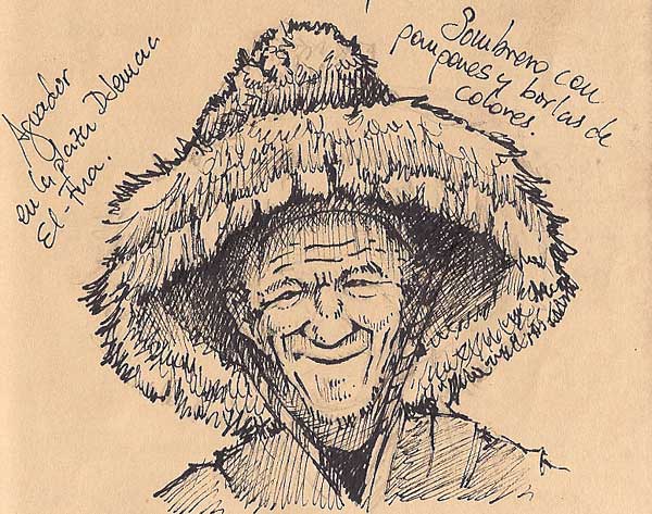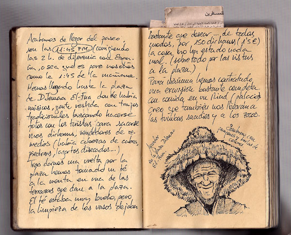 Otra página con dibujo del diario... los aguadores en la plaza de Djema El-Fna , que aprovechan el menor descuido para cascarte un gorro de esos en la cabeza y que te hagas una foto... a cambio de unos cuantos dirhams! |