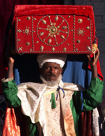 A priest carries a replica of the biblical lost Ark of the Covenant in Axum, Ethiopia in a 2002 file photo.