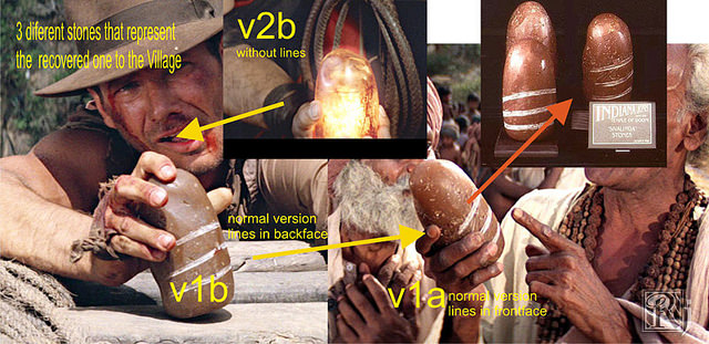 Como curiosidad, en el estudio de las versiones solidas u opacas, podemos ver que hacia el final de la película, en esta última escena, tras la lucha entre Mola ram e Indy en el puente, observamos el viaje de la piedra que Indy consigue recuperar y como esta cambia en función del momento desde la versión v2c (ahora v3) en la mano de Mola Ram hasta la version v1a que Indy entrega al viejo de la villa, pasando por la v1b que sujeta tras subir del puente.