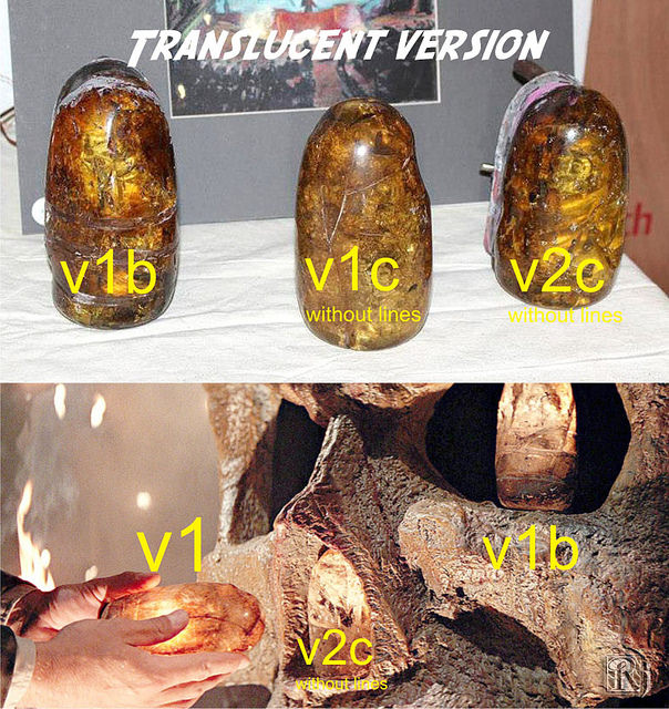 En la escena de la calavera resultan ser otras versiones, a excepción de la v1, versión principal, que es la que coge Indy del ojo derecho de la calavera. Se pueden ver en la expo que hubo a raíz de la presentación del blu ray de Skywalker Ranch con los sistemas para que la luz no se dispersara y fuera dirigida hacia el centro mientras permanecían en sus huecos.