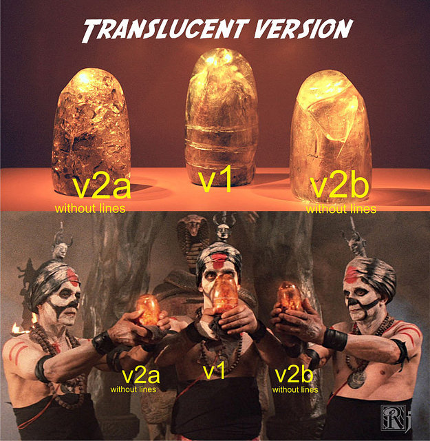 Partiendo de la v1, se realizará al menos dos variantes más para completar las distintas apariencias de las piedras en la película y dar cabida a distintas combinaciones de set de Sankara translucidas y opacas, cosa que estudiaré detenidamente además de otros aspectos en su presentación o exposición.