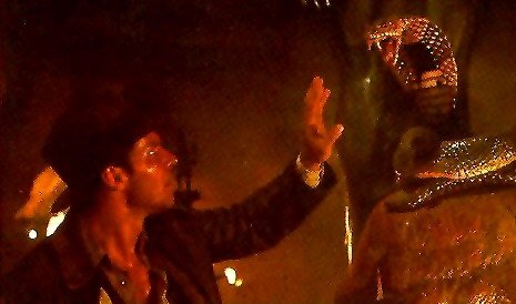 | Yo estoy esperando a que salga el Bluray para comprobarlo mejor, pero yo creo que la serpiente es animatrónica y de hecho se mueve. Quizás para dar la sensación de que Kali maldice a Indy o para dar la sensación de que Indy sufre una alucinación, pero no creo que sea por efecto de la lente. Esperemos a comprobarlo. Ojalá pudiéramos preguntárselo a Spielberg o a Robert Watts. |