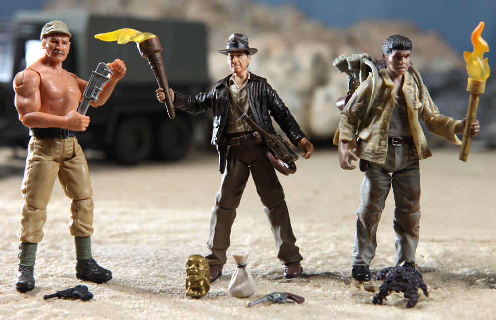 First batch: German mechanic (with gun, hat and wrench), Indy with new head (with torch, sand bag, idol, gun and satchel), and Satipo (with pack, torch, and tarantulas).
