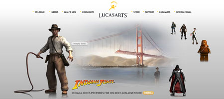 Nuevo diseño para la web de LucasArts. En la página principal podemos ver unas animaciones en flash de sus juegos más inmediatos, como el de Indiana Jones. Si pulsas su imagen podréis ver una animación de Indy lanzando el látigo.