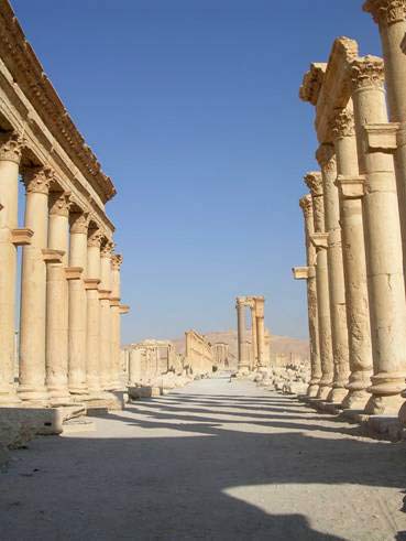 Alrededor del 295, Diocleciano instaló un campamento romano cerca y Palmyra (ciudad de las palmeras) entró en declive. Cayó ante los musulmanes en el 634 y fue completamente destruida por un terremoto en 1089, dejándola en el estado en que la encontramos actualmente, para deleite de los arqueólogos. Mucho más tarde, los árabes construyeron el fuerte "Qala'at ibn Maan" que puede verse en la cima al fondo de las fotografías.